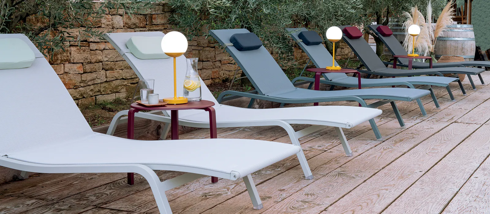 What makes Alizé such a success story? The collection is simply oozing with winning features. It’s robust – aluminium frames and Outdoor Technical Fabric. It’s practical – simply wash it down with water and it’s ready to go. It’s light – the pieces can be stacked in a jiffy (except for the offset table). And it’s comfortable – the sunlounger comes in two widths, and the largest version has four headrest positions, two footrest positions and a zero-gravity position for the ultimate in comfort.