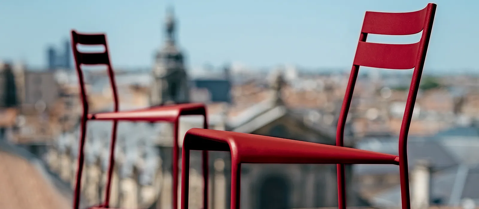 Created by Patrick Jouin, the second designer to collaborate with Fermob after Philippe Starck, the Facto chairs are colour outdoor chairs with a design that will have your terraces brimming with happiness. Their light weight makes them ideal as café terrace chairs and as outdoor bar furniture, in the high version. They are extremely easy to move and store since they can be stacked four at a time! The slim steel tubes and the stylish elegance of these chairs for bar terraces will draw in your customers for a meal or a break.